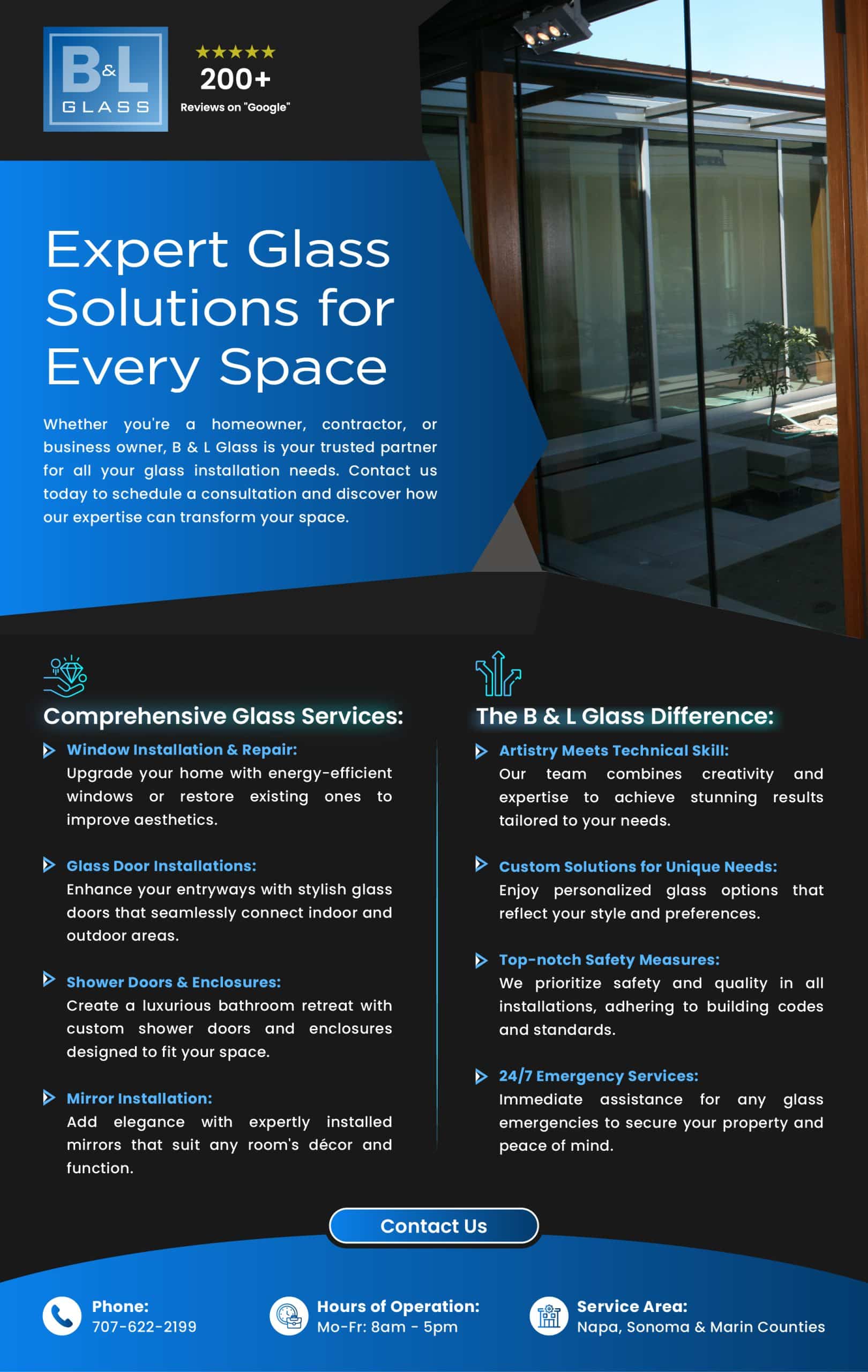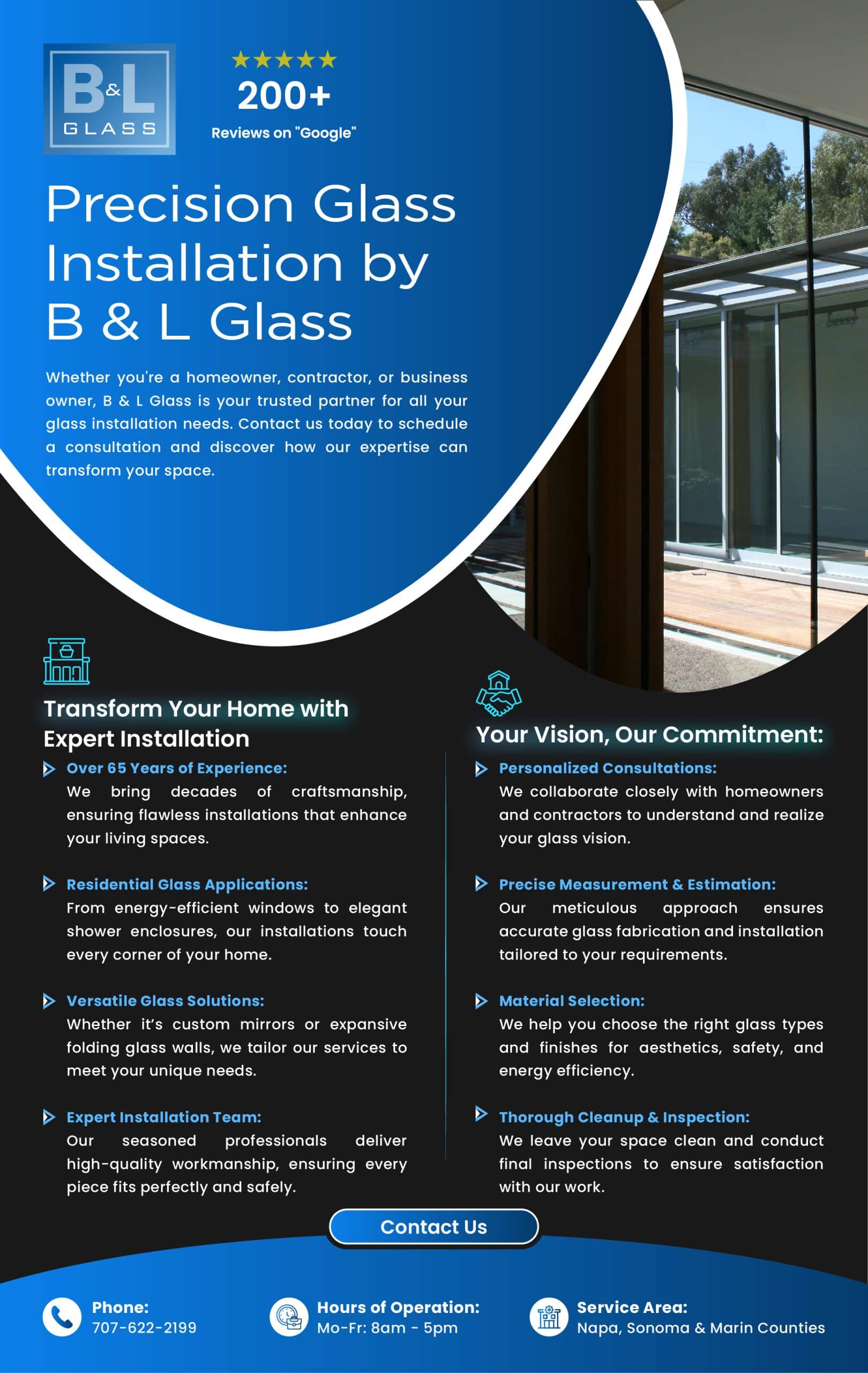 Whether you're a homeowner, contractor, or business owner, B & L Glass is your trusted partner for all your glass installation needs. Contact us today to schedule a consultation and discover how our expertise can transform your space.